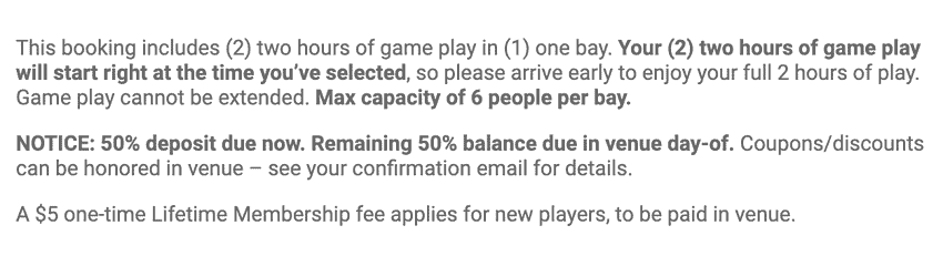 A single bay for 2 people for two hours of play can cost anywhere between $55 and $135 depending on the day and time. Be sure to tack on the one-time $5 fee if you’re a new player.